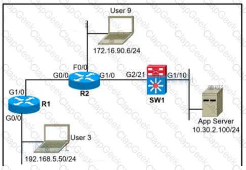 A network administrator must block ping from user 3 to the App Server only. An inbound standard access list is applied to R1 interface G0/0 to block ping. The network administrator was notified that user 3 cannot even ping user 9 anymore. Where must the access list be applied in the outgoing direction to resolve the issue?