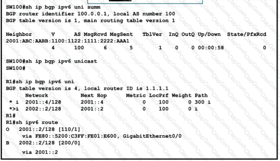Refer to the exhibit SW100 cannot receive routes from R1 Which configuration resolves the issue?