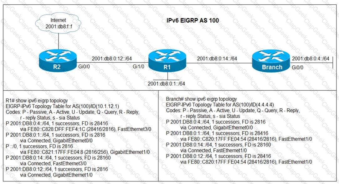 Users in the branch network of 2001:db8:0:4::/64 report that they cannot access the Internet. Which command is issued in IPv6 router EIGRP 100 configuration mode to solve this issue?