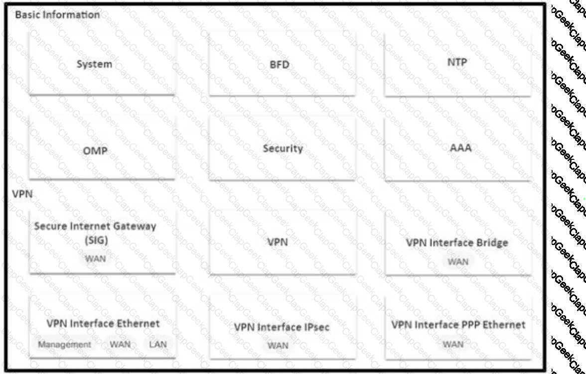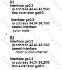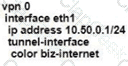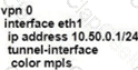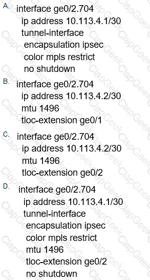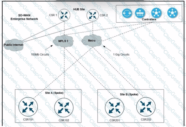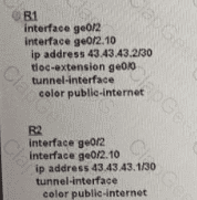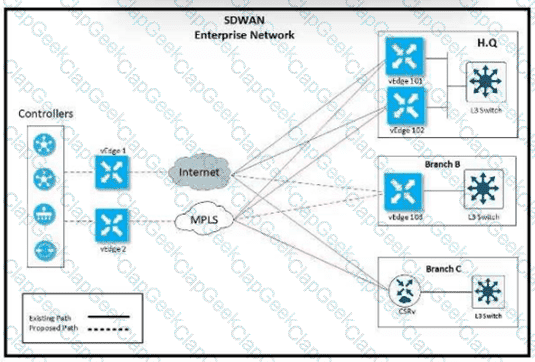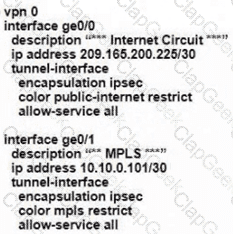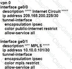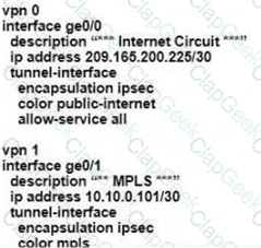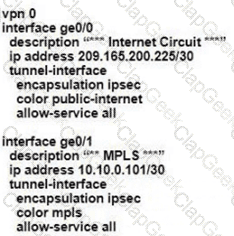 The network team must configure branch B WAN Edge device 103 to establish dynamic full-mesh IPsec tunnels between all colors with branches over MPLS and Internet circuits. The branch ts configured with: