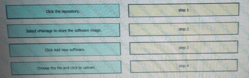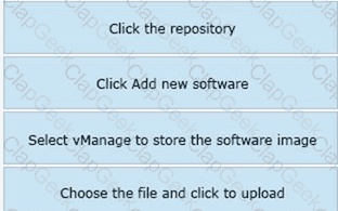 Drag and drop the steps from the left into the order on the right to upload software on vManage repository that is accessible from maintenance > Software Repository.