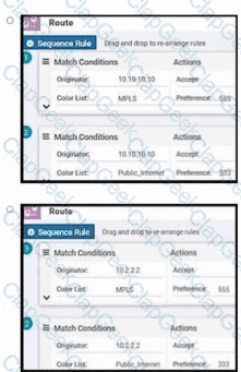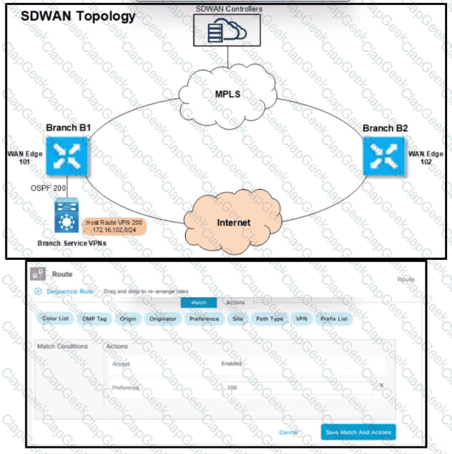Refer to the exhibit. An engineer must configure the Overlay Management Protocol route preference so that when B2 tries to reach host routes advertised by B1 it always chooses the MPLS circuit. Which two match conditions must be configured to accomplish this task? (Choose two.)