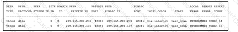 Refer to the exhibit Cisco SD-WAN is deployed with controllers hosted in a data center All branches have WAN Edge devices with dual connections to the data center one via Internet and the other using MPLS Three branches out of 20 have issues with their control connections on MPLS circuit The local error refers to Control Connection Failure Which action resolves the issue*?