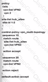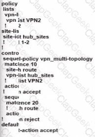 Which control policy assigned to Drenches in the out direction establishes a strict hub-and-spoke topology tor VPN2?