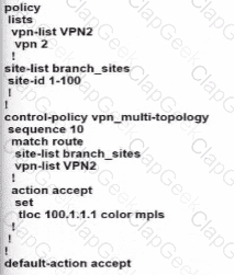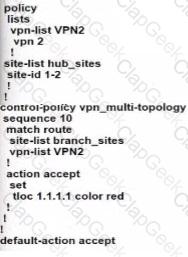 The SD-WAN network is configured with a default full-mash topology. An engineer wants Barcelona and Paris to communicate to each other through the London site using a control Which control policy configuration accomplishes the task?