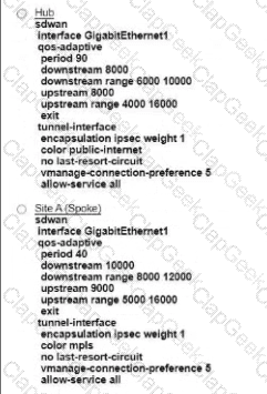 Refer to the exhibit An engineer must configure a QoS policy between me hub and site A (spoke) over a standard internet circuit where traffic shaping is adjusted automatically based on evaiiabk» bandwidth Which configuration meets the requirement?