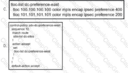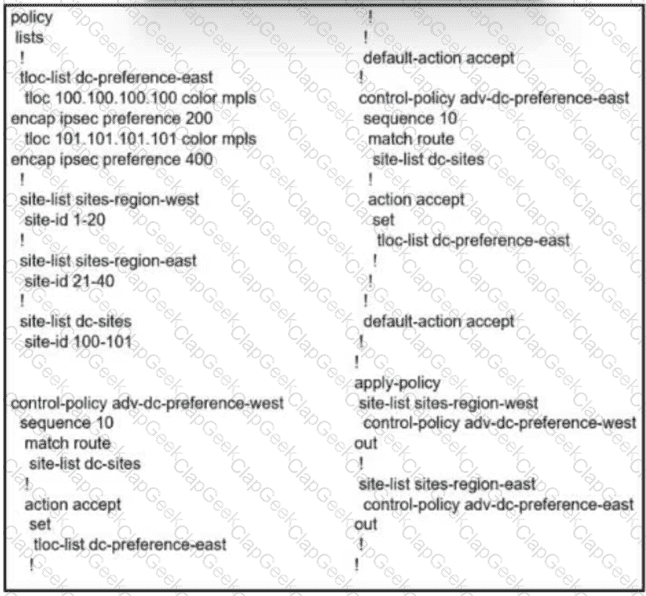 A customer wants to implement primary and secondary Cisco SD-WAN overlay routing for prefixes that are advertised for both data centers. The east data center (TLOC 101.101.101.101) is primary for east sites, and the west data center (TLOC 100.100.100.100) is primary for west sites. Which configuration change achieves this objective?
