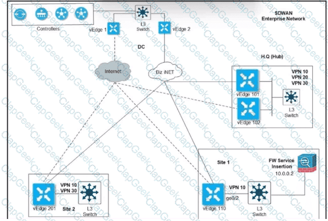 Refer to the exhibit. A customer wants to deploy service insertion at site1. Which traffic from VPN 10 must route to this site through a firewall. A policy must be in place to route VPN 10 traffic from all sites toward this firewall. Which configuration must be on the vSmart controller to meet this requirement?
