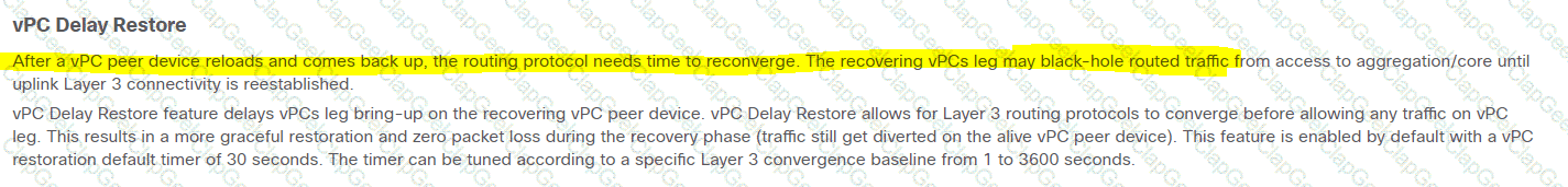 An engineer configured the OSPF protocol in the vPC topology. During the catastrophic failure of one of the vPC the member switches, the traffic was routed to a black hole. This route was caused by the long convergence time caused by the delay of the of the vPC member switch reboot. After the failure, the engineer rebooted both switches, but the secondary switch powered on before the primary one. It caused all the vPCs to be shut down due to consistency-check violations. Which two features must be used to prevent these situations from happening in the future? (Choose two.)