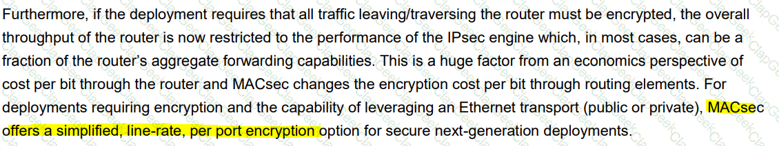 An engineer must secure the payload traversing across the DCI. The solution must support confidentially and integrity and it must be open standard. The solution must encrypt Ethernet frames regardless of the upper layer protocol used. Which technology must be used to support these requirements?