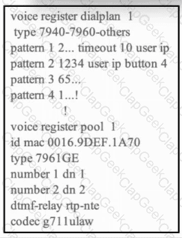 Refer to the exhibit. An engineer is implementing the Cisco UCME and must set up a dial plan for the 7961 SIP phones to recognize digit strings dialed by users.