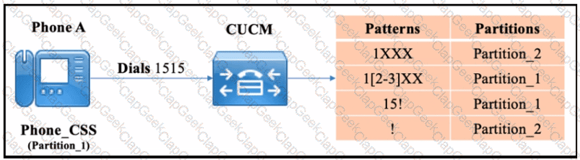 The Cisco UCM is configured with four route patterns. When phone A dials 1515, which pattern does Cisco UCM choose as the correct match?