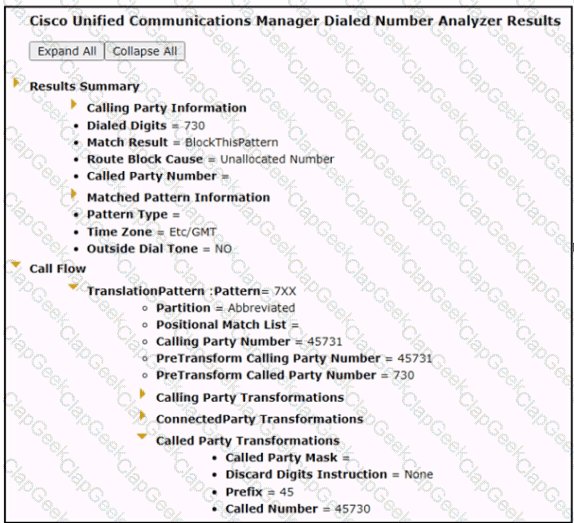 A user cannot call number 730. which Is an abbreviated number for 45730. The engineer recently configured a translation pattern In Cisco UCM. The newly configured translation pattern of 7XX prefixes the digits 45. The engineer uses DNA to troubleshoot the issue. What is the reason for this problem?