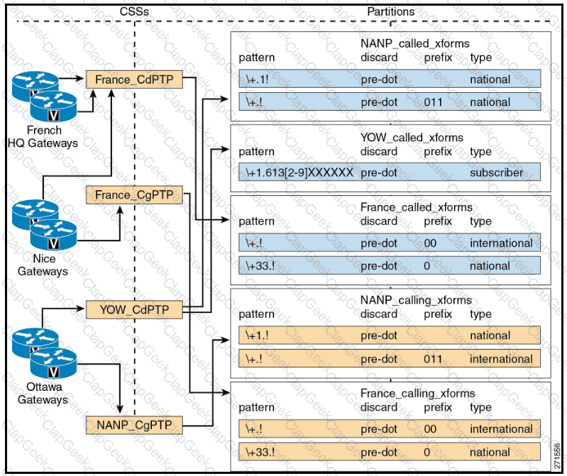 Within the North American Numbering Plan, gateways located in Ottawa, Canada and marked as “YOW” are assigned to the Calling Party Transformation CSS NANP_CgPTP, which contains partition NANP_calling_xforms. What is the calling-party number and the numbering type if the calling user +1613-555-1234 dials the number?