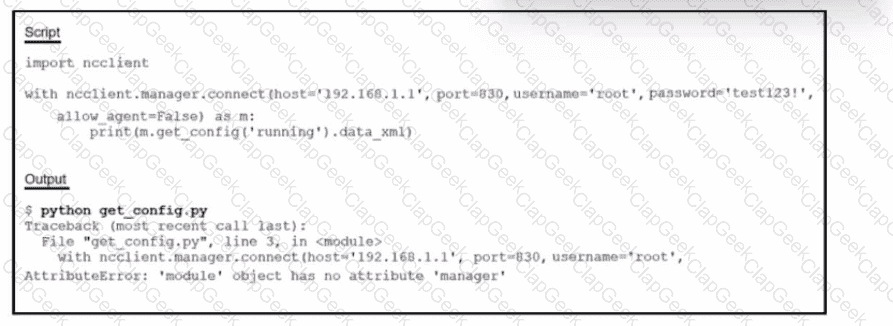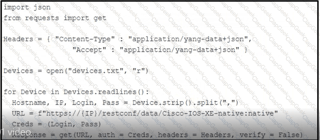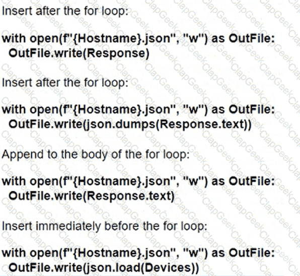 Refer to the exhibit. How should the script be completed so that each device configuration is saved into a JSON-formatted file under the device name?