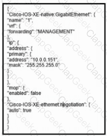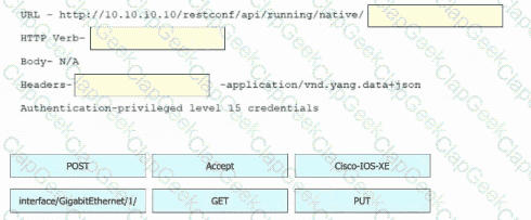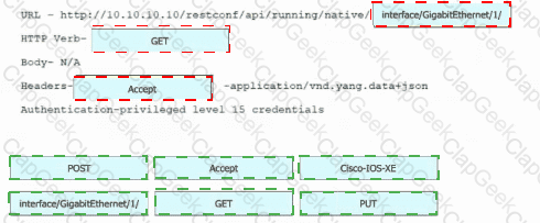 Refer to the exhibit. Drag and drop the snippets into the RESTCONF request to form the request that returns this response. Not all options are used.