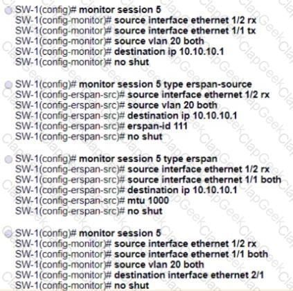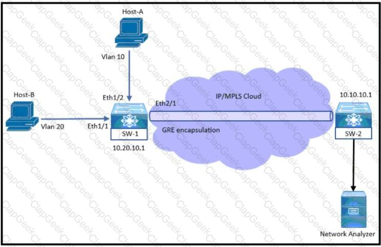 Refer to the exhibit. An engineer monitors ingress traffic from Host-A and all traffic for VLAN 20 from Host-B Which configuration must be implemented to monitor and export traffic to Network Analyzer?