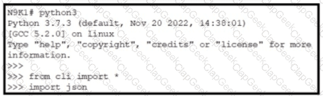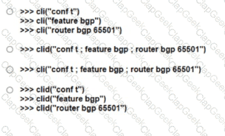 Refer to the exhibit A network engineer must use a Cisco on-box Python CLI to configure the BGP AS 65501 on Cisco Nexus 9000 Series Switch The output from the command must be returned as raw output instead of JSON format Which command set must be used to complete the configuration?