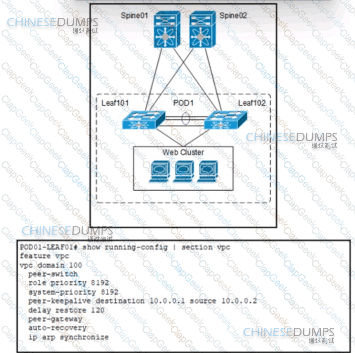 Refer to the exhibit. An engineer implements a VXLAN pod deployment with the vPC. During an upgrade of switches in POD1. Leaf 102 starts to rejoin the vPC pair. Also, traffic to and from the Web Cluster becomes intermittent for five minutes. Which additional command must be applied on both switches to resolve this issue?