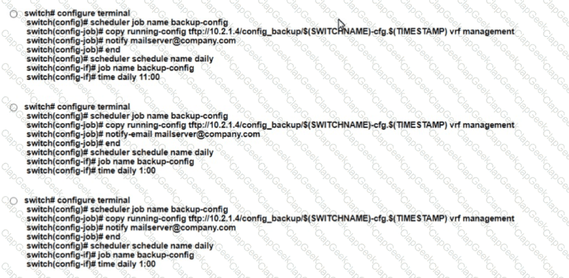 A network administrator must create a daily scheduler job on a Cisco Nexus 9000 Senes Switch to back up the device configuration and transfer the backed-up configuration to an external server The backup task must meet these requirements