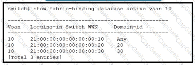 Refer to the exhibit An engineer must configure fabric binding on a Cisco MDS 9000 Series Switch to match the output Which fabric database configuration accomplishes this goal?