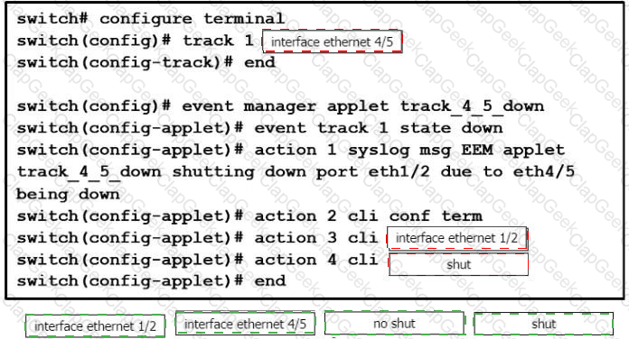 An engineer must shut down the Ethernet 1/2 interface when the Ethernet 4/5 interface state is down. Drag and drop the CLI commands from the bottom onto the blanks in the exhibit to implement this EEM. Not all commands are used.