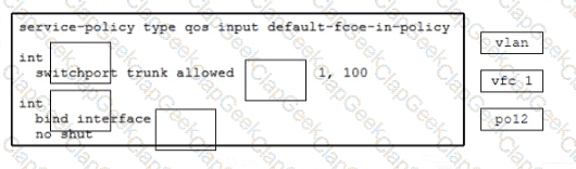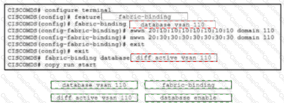 An engineer musí Implement fabric binding on the Cisco MDS 9000 Series Switch lor only VSAN 110. Both WWNs must be part of domain 110. The configuration for the active VSAN must be compared to the active configuration after the deployment Is completed. Drag and drop the code snippets from the bottom onto the blanks In the code on the top to complete the configuration. Not all code snippets are used