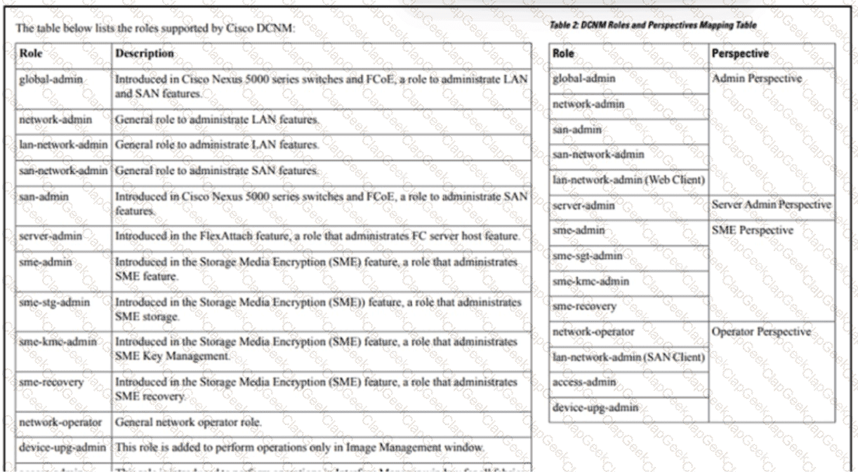 Refer to the exhibit. An engineer is configuring Cisco Data Center Network Manager to automate the provisioning of Cisco Nexus 9000 Series Switches. The engineer must configure user access for network engineers to permit device operations in Interface Manager. The solution must hide Admin and Config Menu items in Interface Manager Which two roles must be assigned to the network engineers to meet these requirements? (Choose two.)