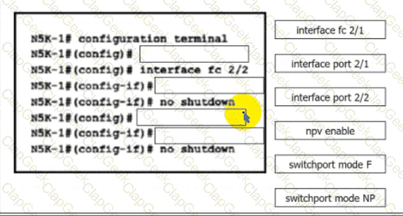 The server is sending traffic to the storage server using Fiber Channel protocol. The requirement is for the N5K-1 to forward traffic to MDS9k-1. Drag and drop the configuration steps from the right to complete the configuration for N5K-1 on the left. Not all configuration steps are used.