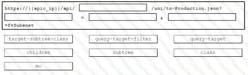 Drag and drop the keywords onto the URL request to collect all the subnets configured under tenant Production using a REST API. Not all options are used.