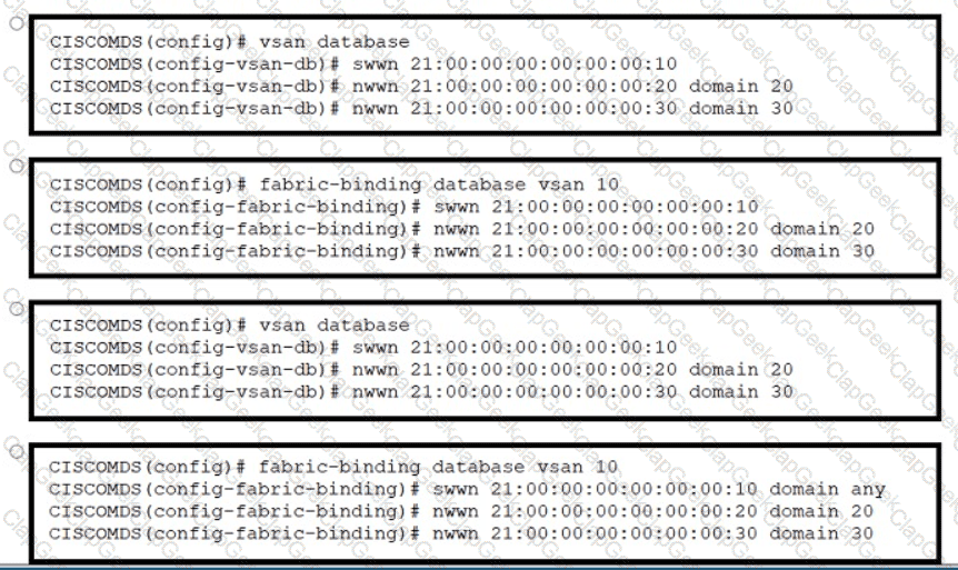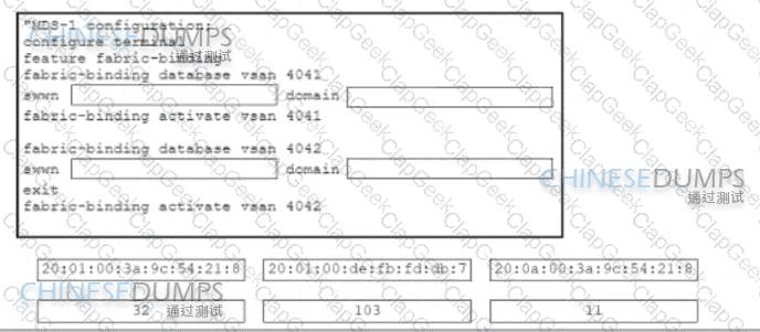 Refer to the exhibit The VSAN 4041 and 4042 are exchanged between two Cisco MDS 9000 Series Switches called MDS-1 and MDS-2 The objective is to deploy a security mechanism on MDS-1 to allow MDS-2 to join the fabric exclusively Drag and drop the code snippets from the bottom onto the boxes in the code to complete the MDS-1 configuration Not all code snippets are used.