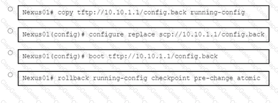 A network engineer must roll back a configuration change made on a Cisco Nexus 9300 Series Switch. Before the change, the network engineer created a checkpoint named pre-config. The rollback abort if any errors occur. Which command must be used to accomplish these objectives?