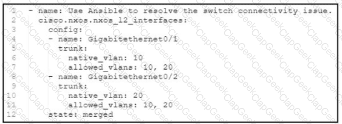 Refer to the exhibit An engineer must resolve a connectivity issue on a Cisco 9000 Senes Switch that was configured by using Ansible The switch must be configured to meet these requirements •Interface G*gabitethemet0/1 must be a member of VLAN 10 in access mode •Interface G*gabetethernet0/2 must allow VLANs 10 and 20 in trunk mode, with native VLAN 20