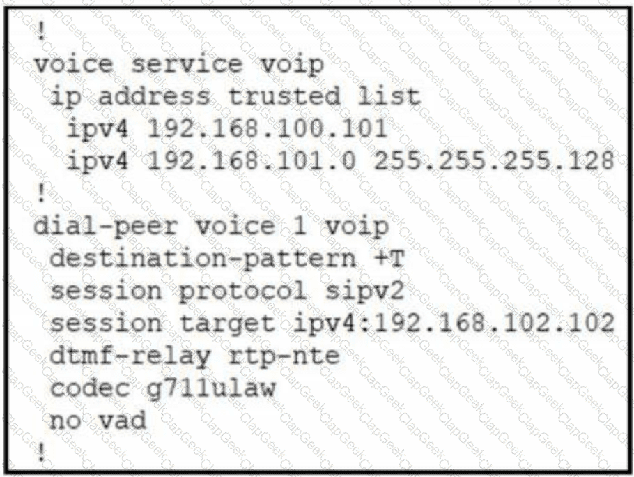 next The engineer logs In to the CUBE, enters the dial.peer configuration level, and runs the voice-class codec 100 command. Which set of commands completes the configuration?