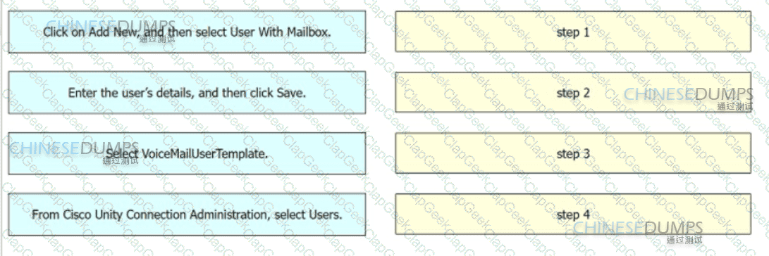 An engineer must add a new user account and mailbox in Cisco Unity Connection. Drag and drop the configuration steps from the left into the correct order on the right.