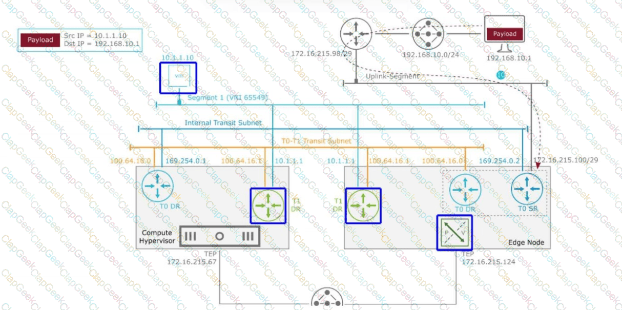 An administrator is troubleshooting the packet flow of an incoming response to an ICMP Reply payload destined for 10.1.1.10 in the diagram.