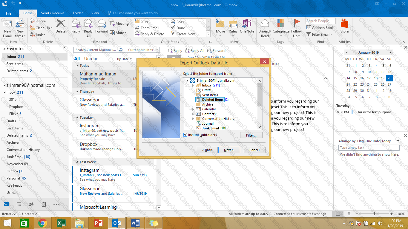 Export the contents of the Deleted items folder and its subfolders to a .pst file. Save the file in the Documents folder as ''Deleted.pst''. Do not enter a password.