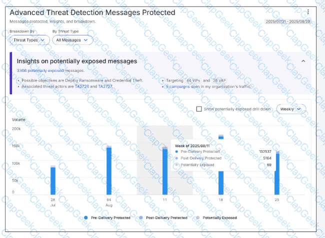 Based on the metrics for the highlighted week, how many malicious messages were blocked by TAP at the email gateway?