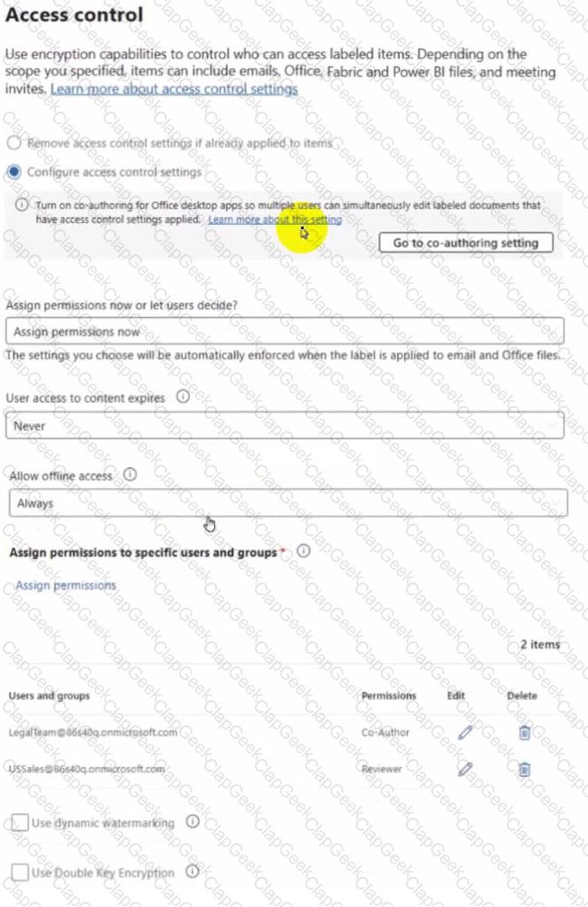 The Access control settings for the sensitivity label are configured as shown in the exhibit (Click the Exhibit tab.)