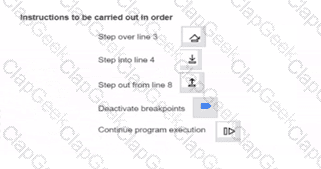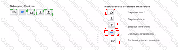 A breakpoint is set on line 3. When the application is run. it will stop at line 3. You need to debug the code. Drag each debugging control from the left to the correct instruction on the right. You will receive partial credit for each correct answer
