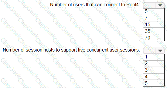 What will be the maximum number of users that can connect to Pool4, and how many session hosts are needed to support five concurrent user sessions? To answer, select the appropriate options in the answer area.
