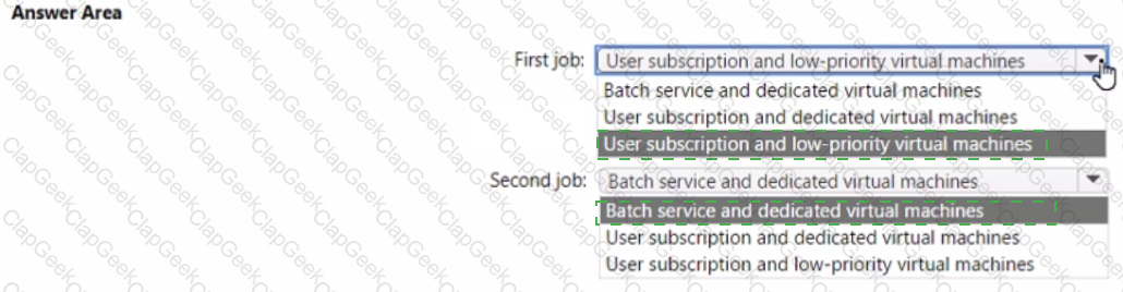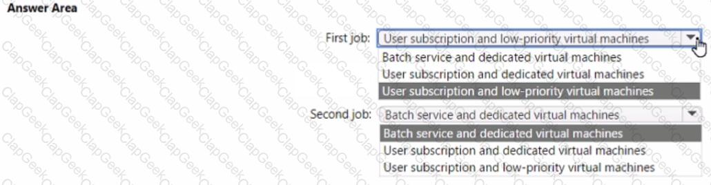 You are designing a cost-optimized solution that uses Azure Batch to run two types of jobs on Linux nodes. The first job type will consist of short-running tasks for a development environment. The second job type will consist of long-running Message Passing Interface (MPI) applications for a production environment that requires timely job completion.