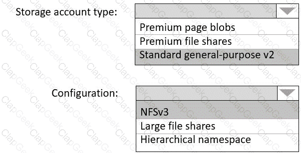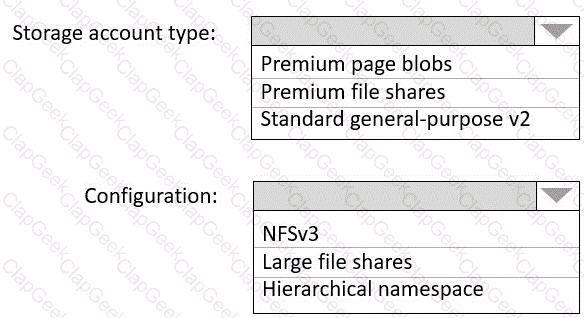 Which Azure Storage account type and storage service should you recommend? To answer, select the appropriate options in the answer area.