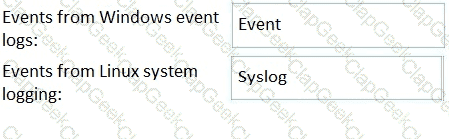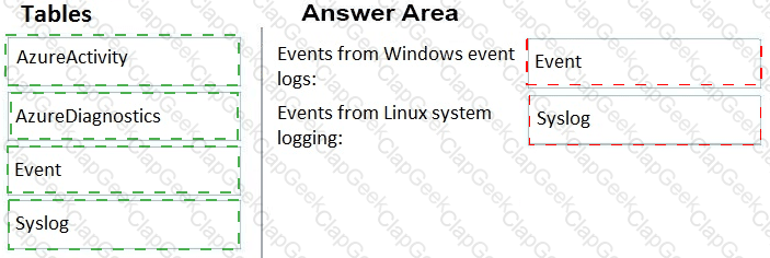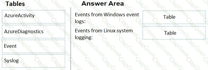 Which Log Analytics tables should you query? To answer, drag the appropriate tables to the correct log types. Each value may be used once, more than once, or not at all. You may need to drag the split bar between panes or scroll to view content.
