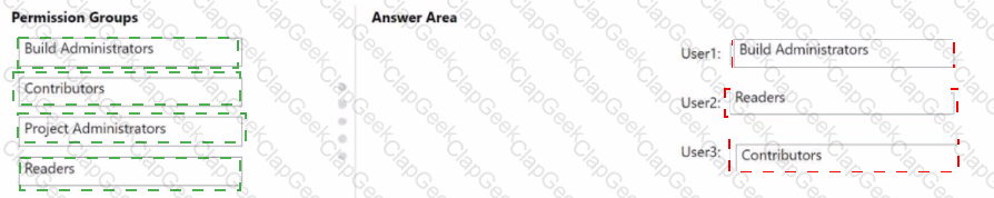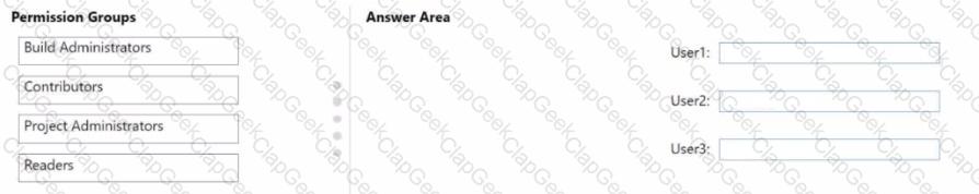 To which permission group in AzureDevOps should you add each user? To answer, drag the appropriate permission groups to the correct users. Each permission group may be used once, more than once, or not at all. You may need to drag the split bar between panes or scroll to view content.