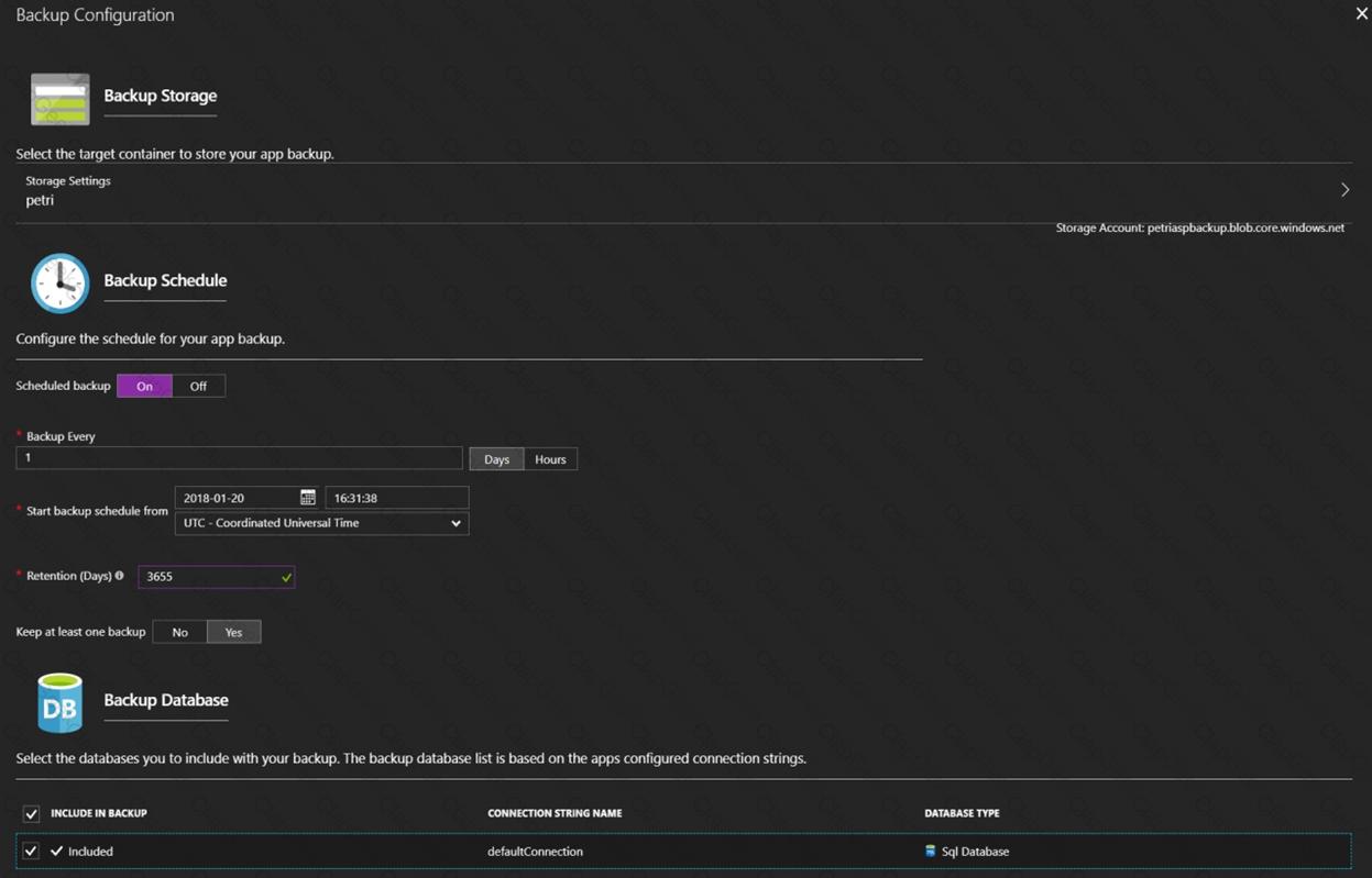Your company plans to implement a new compliance strategy that will require all Azure web apps to be backed up every five hours.