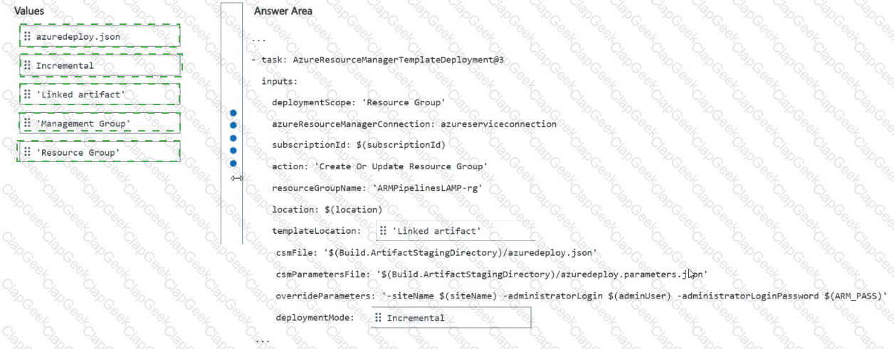 How should you configure the pipeline task? To answer, drag the appropriate values to the correct targets. Each value may be used once, more than once, or not at all. You may need to drag the split bar between panes or scroll to view content.