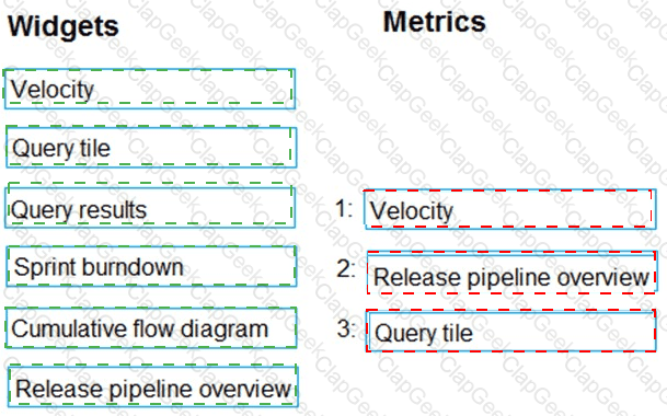 Which widget should you use for each metric? To answer, drag the appropriate widgets to the correct metrics. Each widget may be used once, more than once, or not at all. You may need to drag the split bar between panes or scroll to view content.