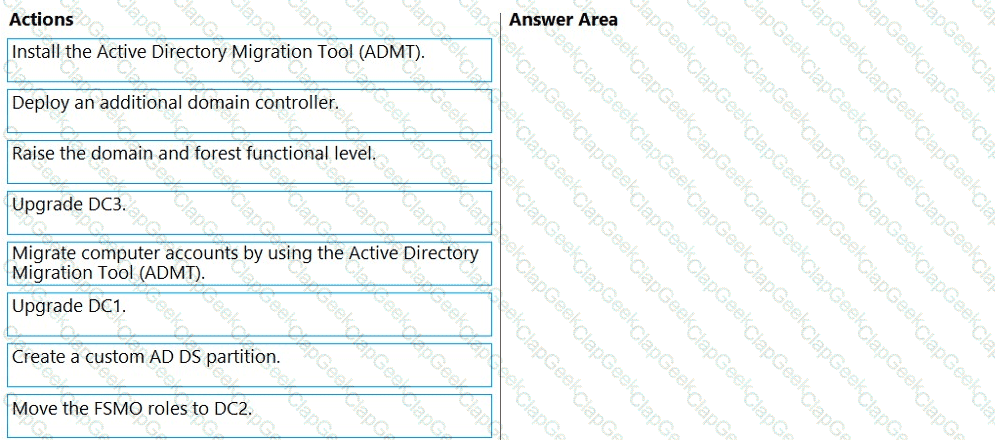 Which four actions should you perform in sequence from a domain controller? To answer, move the appropriate actions from the list of actions to the answer area and arrange them in the correct order.