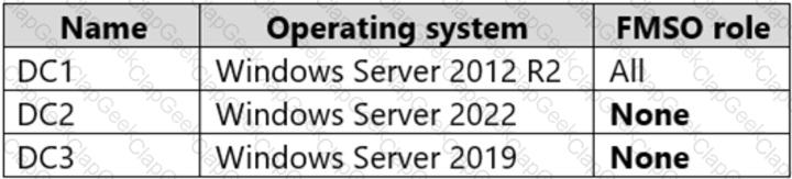 Your network contains an Active Directory Domain Service (AD DS) domain named contoso.com. The domain contains three domain controllers named DC1, DC2, and DC3.
